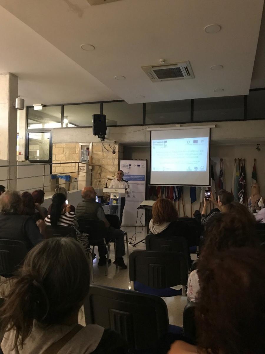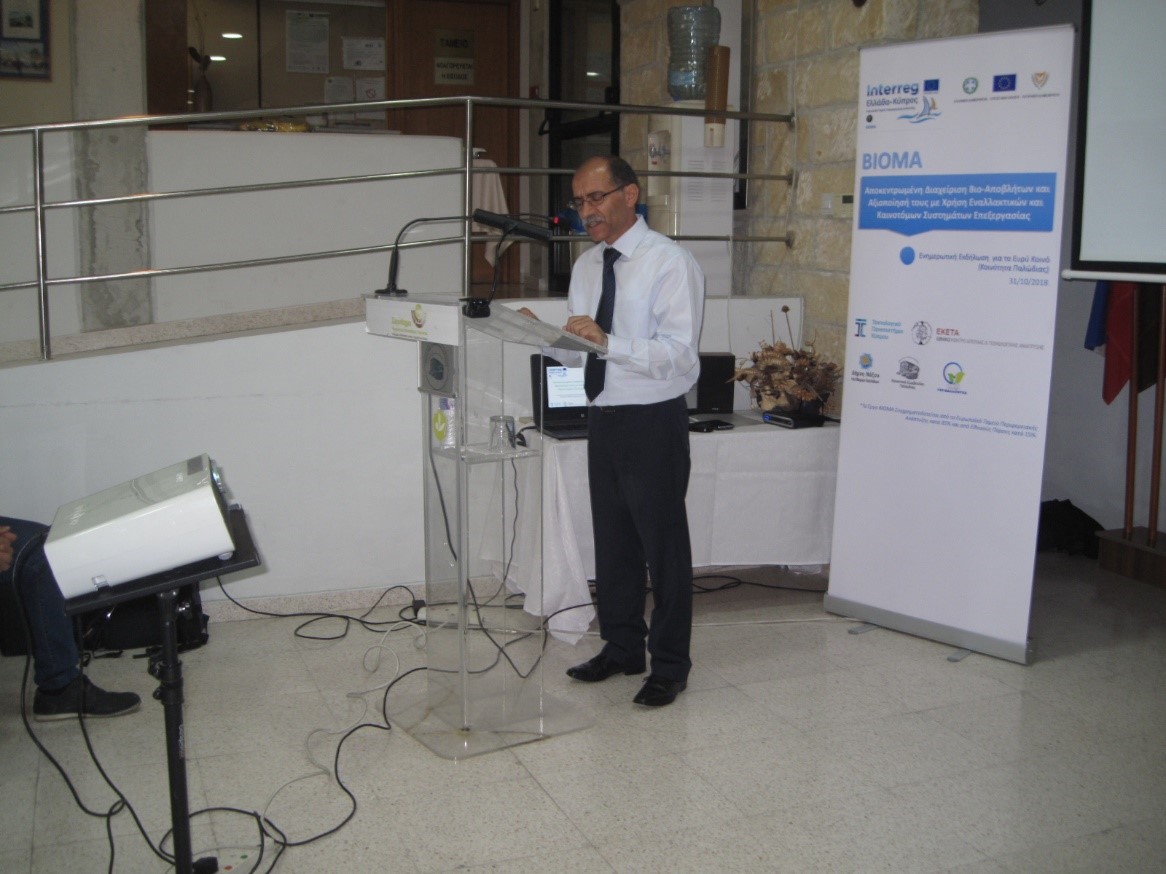 Κατά τη διάρκεια της εκδήλωσης, οι παρευρισκόμενοι ενημερώθηκαν από τον κοινοτάρχη κο. Χαράλαμπο Ζορμπά για το Ευρωπαϊκό Πρόγραμμα. Έπειτα ο Δρ. Πέτρος Γ. Σάββα από το ΤΕΠΑΚ, συντονιστής του Έργου, παρουσίασε αναλυτικά την αποκεντρωμένη διαχείριση των βιοαποβλήτων και την αξιοποίηση τους με χρήση εναλλακτικών και καινοτόμων συστημάτων επεξεργασίας. Πέραν από τους ομιλητές (εταίρους) και τους κάτοικους της κοινότητας, στην ημερίδα παρευρέθηκε και εκπρόσωπος του Τμήματος Περιβάλλοντος (εταίρος του Προγράμματος ΒΙΟΜΑ).