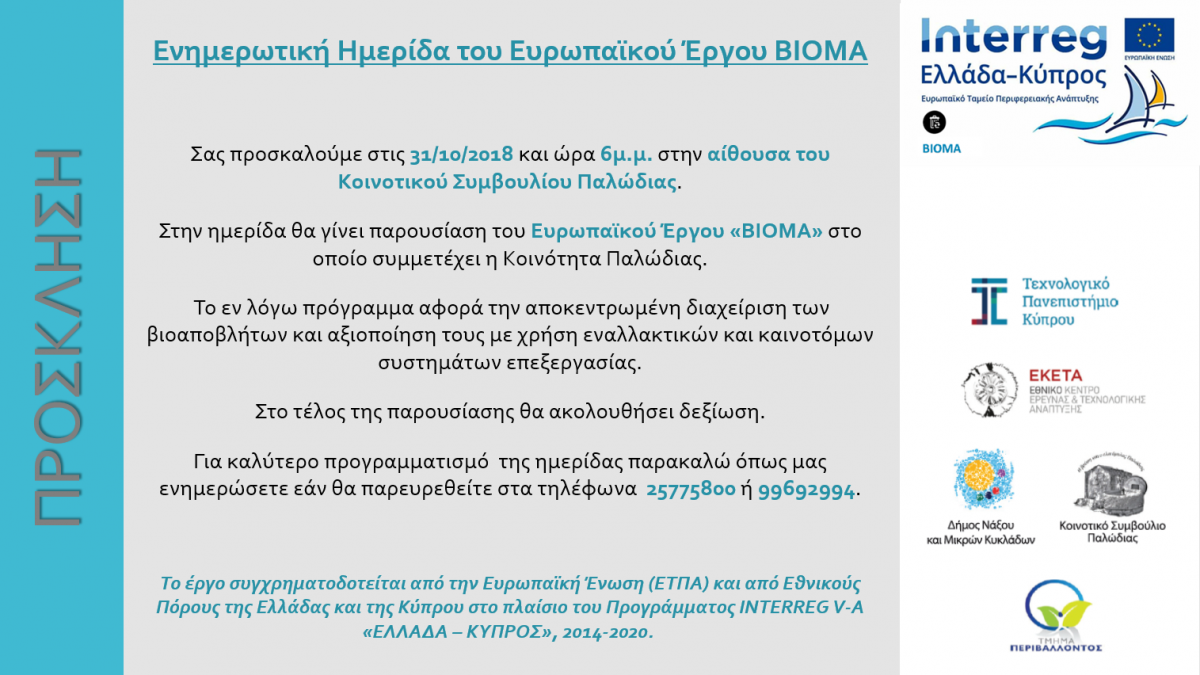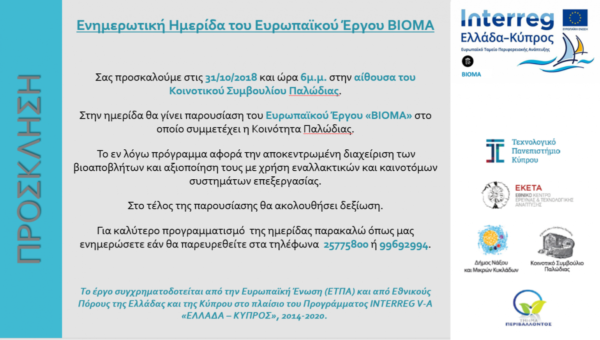 Στο πλαίσιο της Ευρωπαϊκής Πράξης «ΒΙΟΜΑ» διοργανώθηκε στις 31 Οκτωβρίου, στην αίθουσα του Κοινοτικού Συμβουλίου Παλώδιας, ενημερωτική ημερίδα προς τους κάτοικους της εν λόγω κοινότητας.