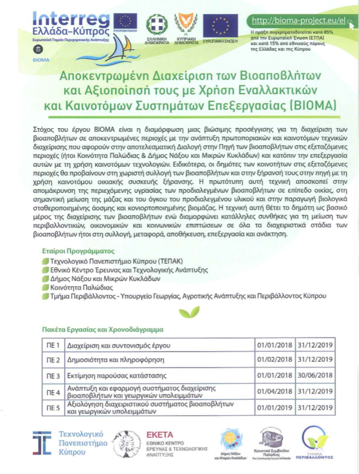 Στο πλαίσιο της ΕυρωπαΪκής Πράξης ΒΙΟΜΑ διοργανώθηκε το Σάββατο, 20/04/2019, στο Κέντρο Νεότητας Παλώδιας, η 2η Ενημερωτική Ημερίδα προς τους κατοίκους της Κοινότητας.